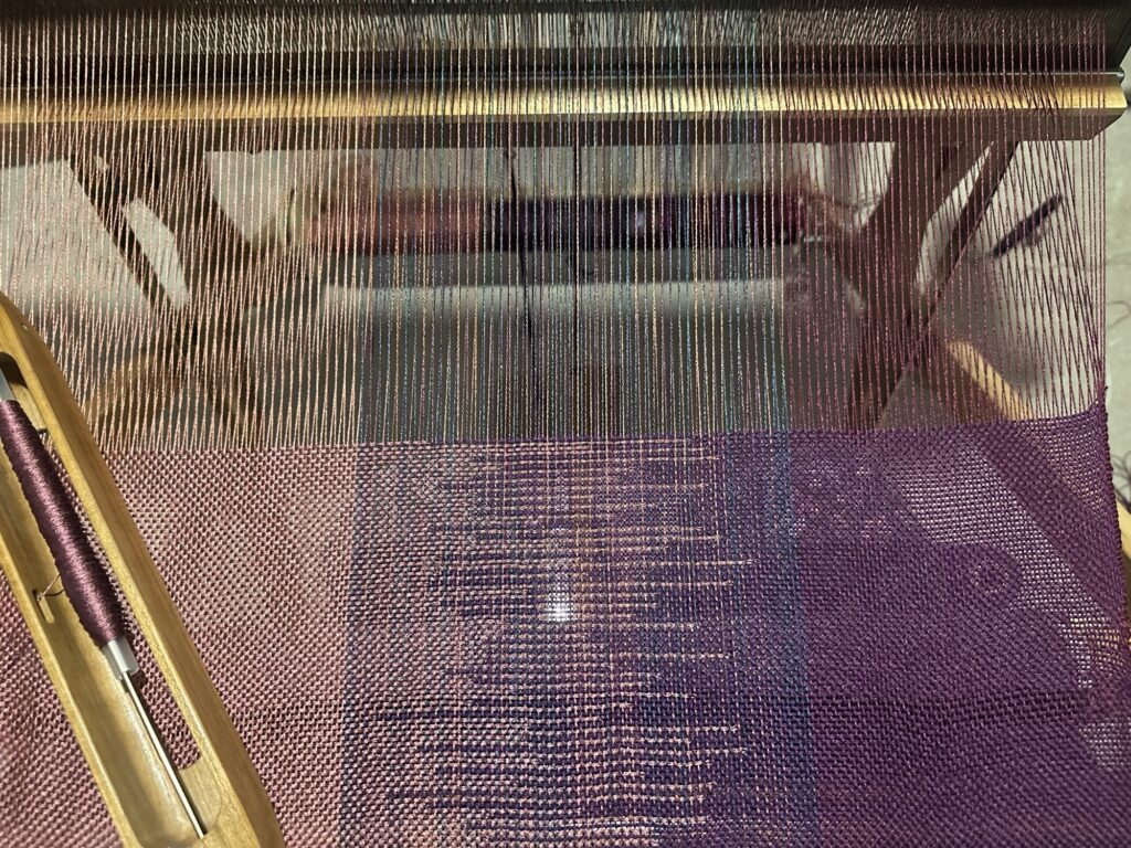 I decided I need to use up what I have in my own stash before I get any more, so I decided to weave with this mix of a muted coral/dusty pink, purple-ish burgundy, and a variegated mix of the two with a few other colours added in. Frankly, colours I wouldn’t normally use.