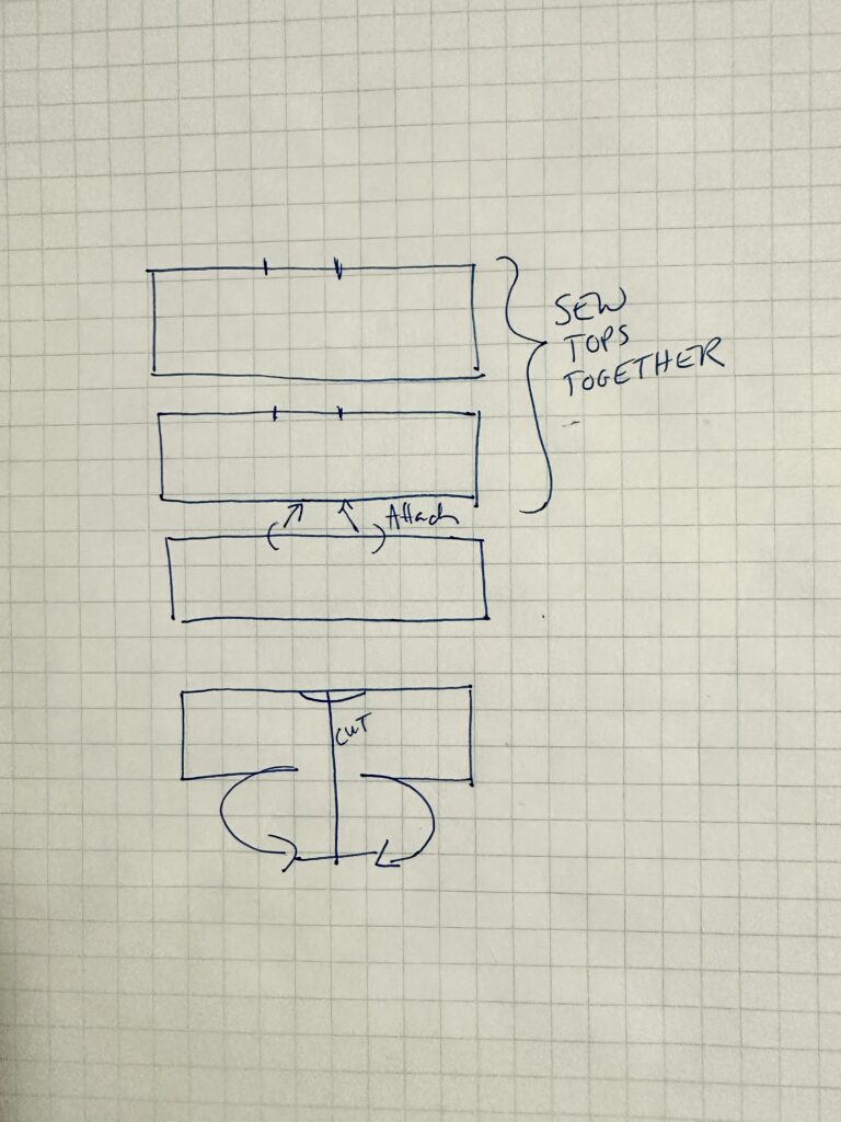 Cut fabric into 3 even pieces that were roughly the width of my outstretched arms from wrist to wrist. I stitched the edges with a zig zag stitch to prevent it from unravelling.